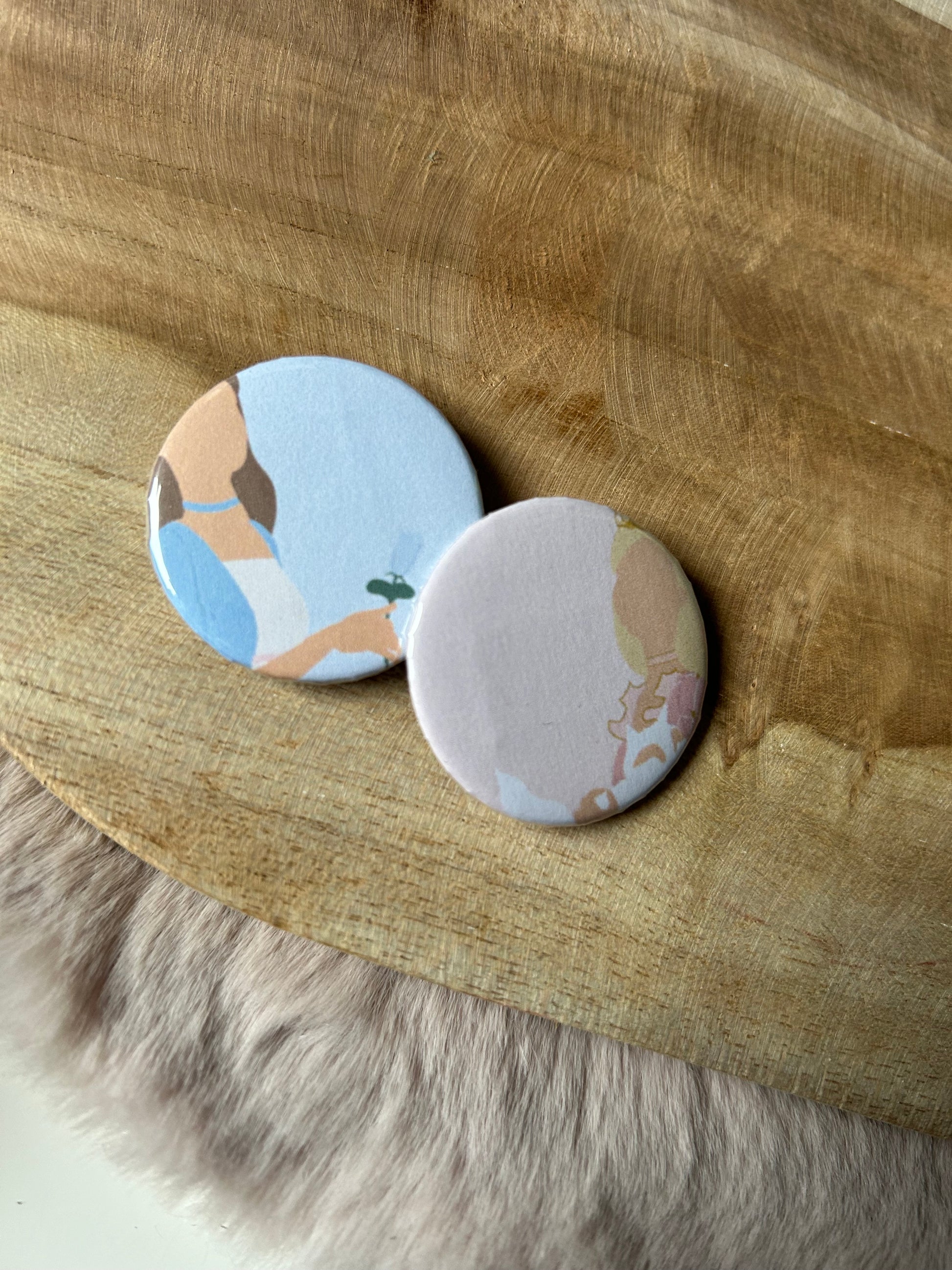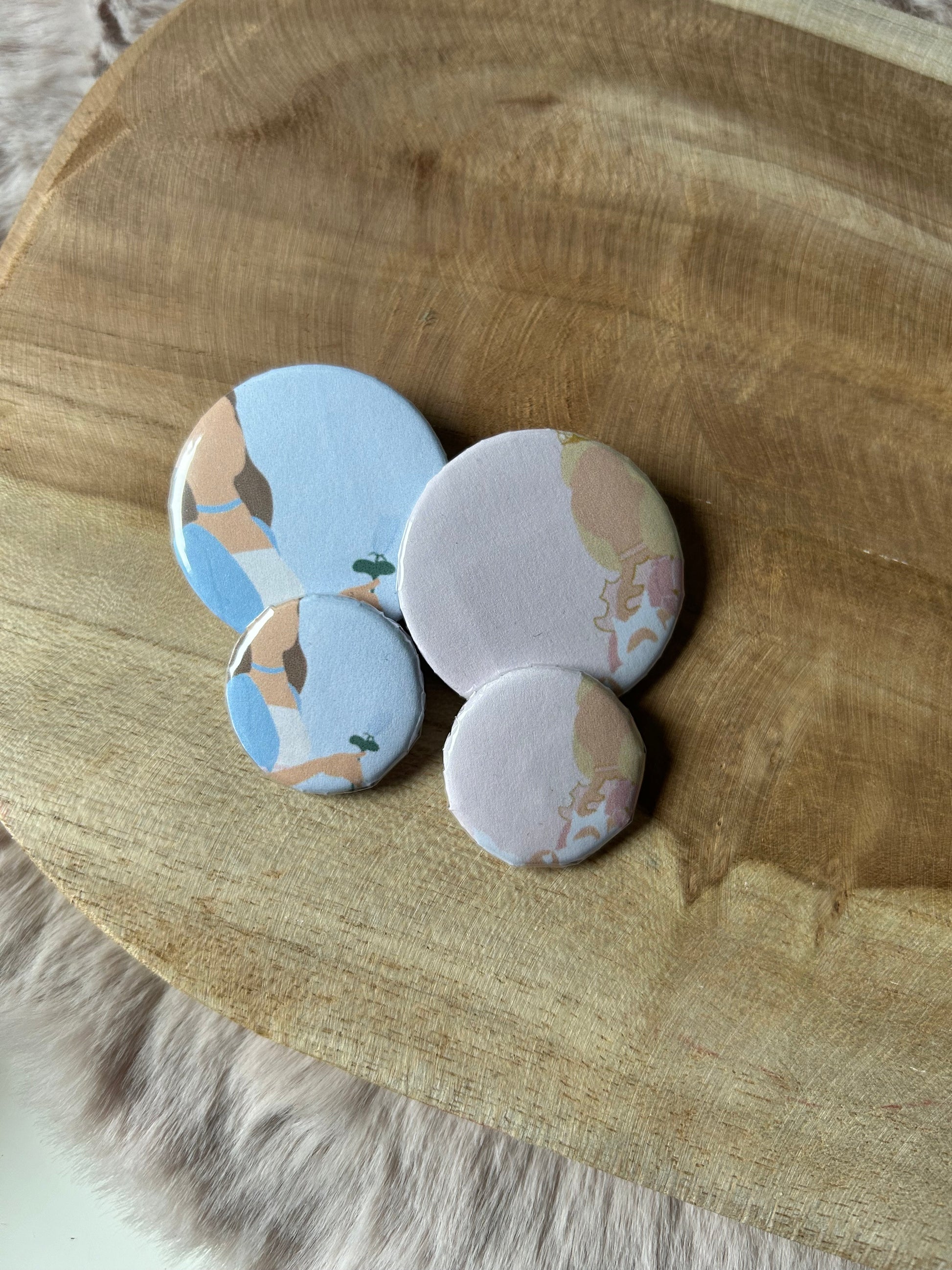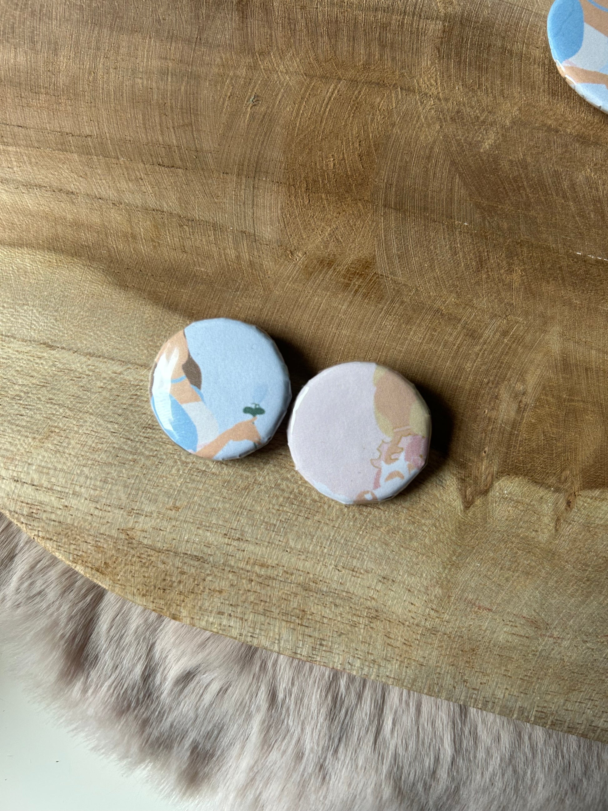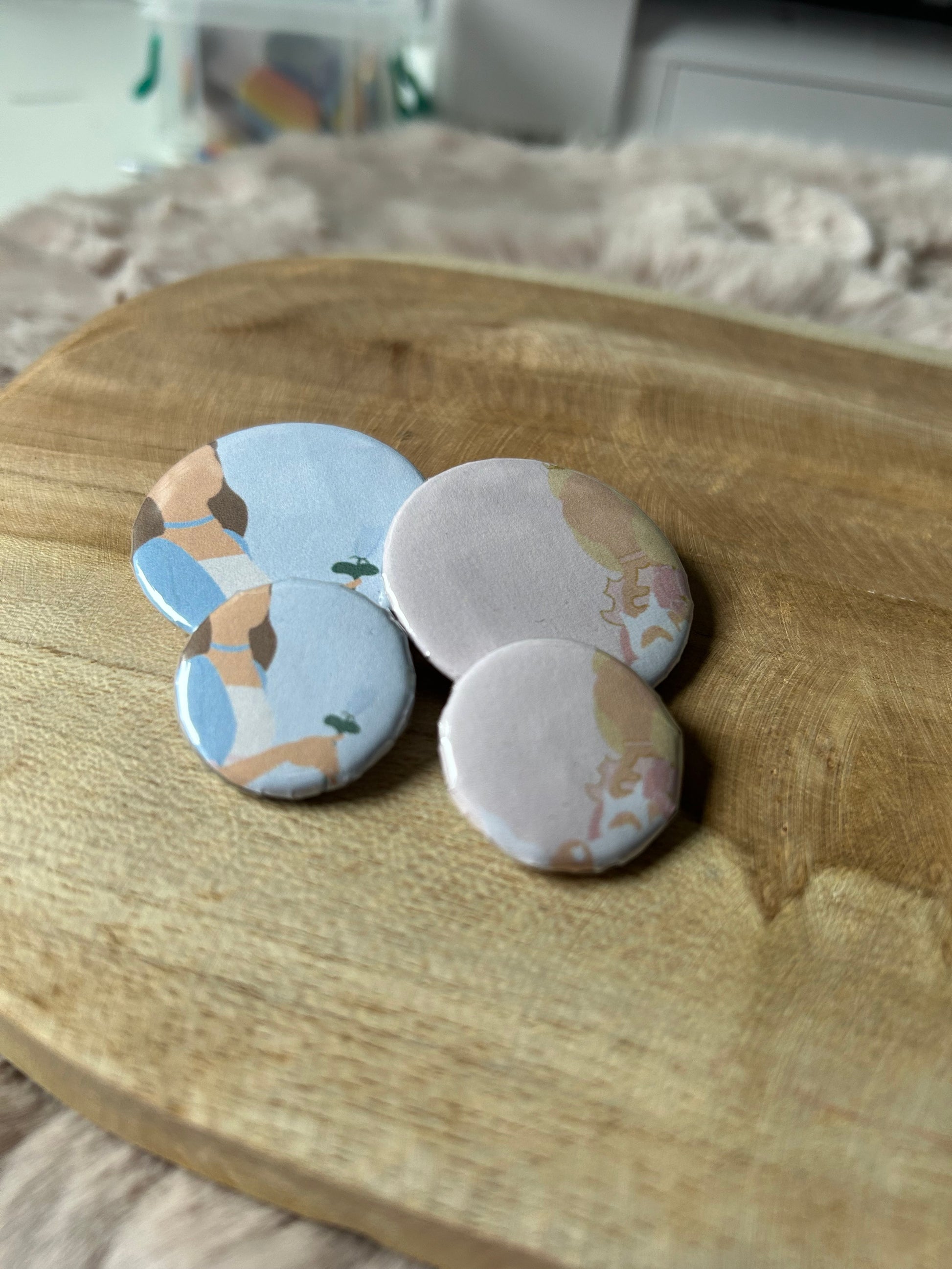 Our buttons are completely handmade, we create the print, print it out, cut it out by hand and then press it in the button press! All handmade from the start!