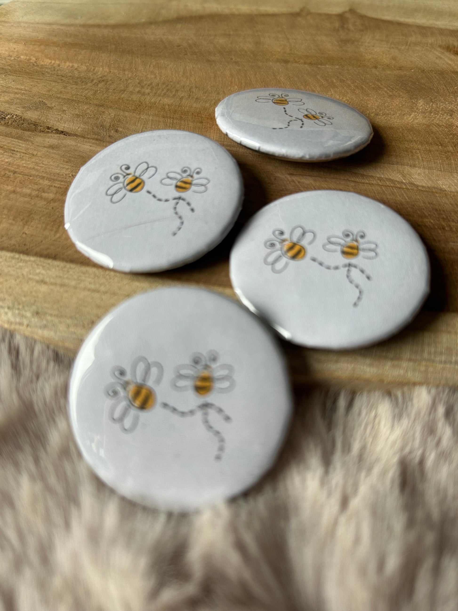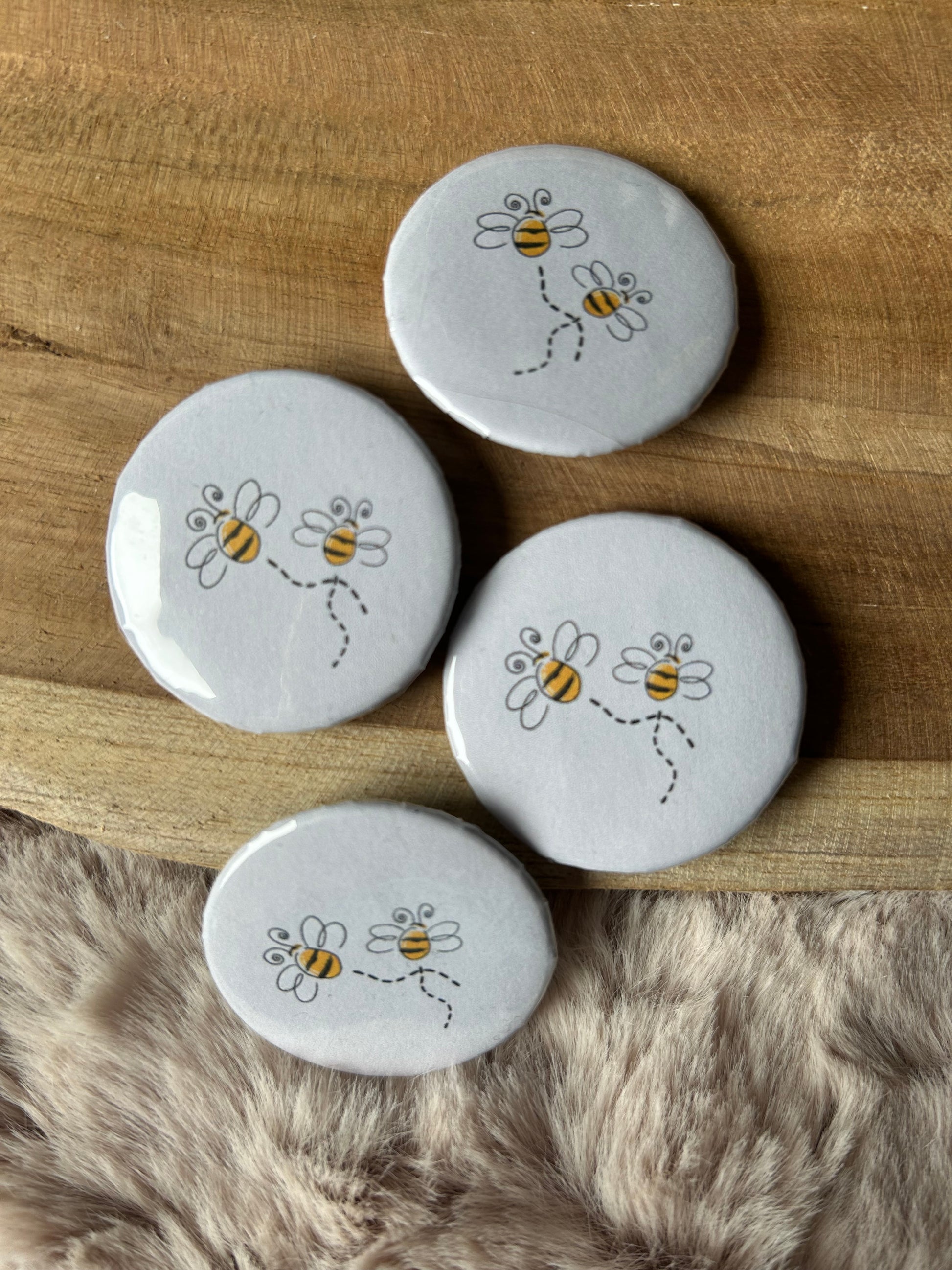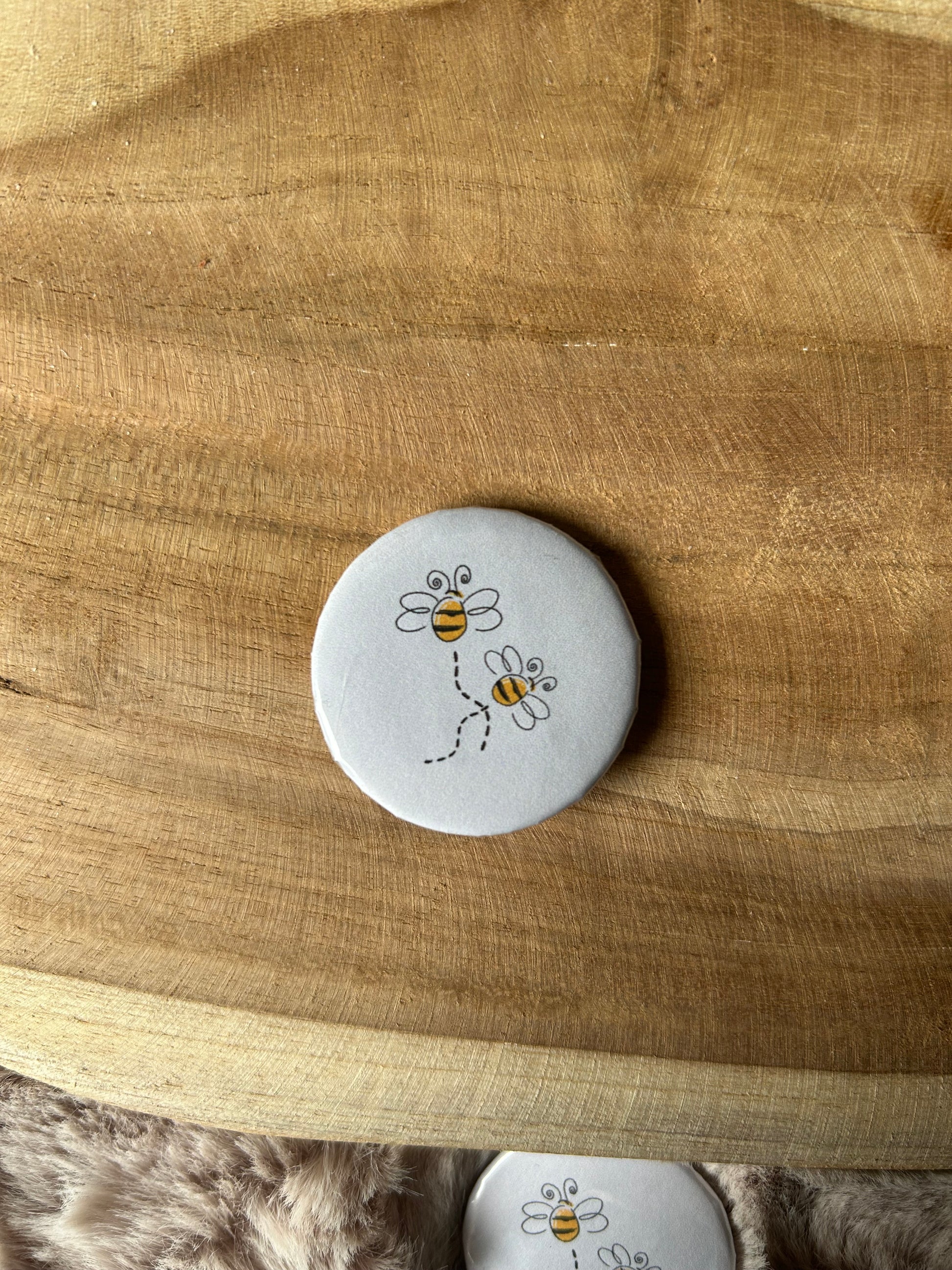 Our buttons are completely handmade, we create the print, print it out, cut it out by hand and then press it in the button press! All handmade from the start! These only come in 37 mm for now.