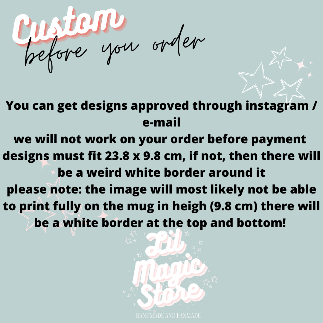 - You choose an image you want on your mug, the image has to fit between 23.8 cm x 9.8 cm. (there will be a white border on the top and bottom as our mugs are slightly slanted at the top and bottom! we can't change that)