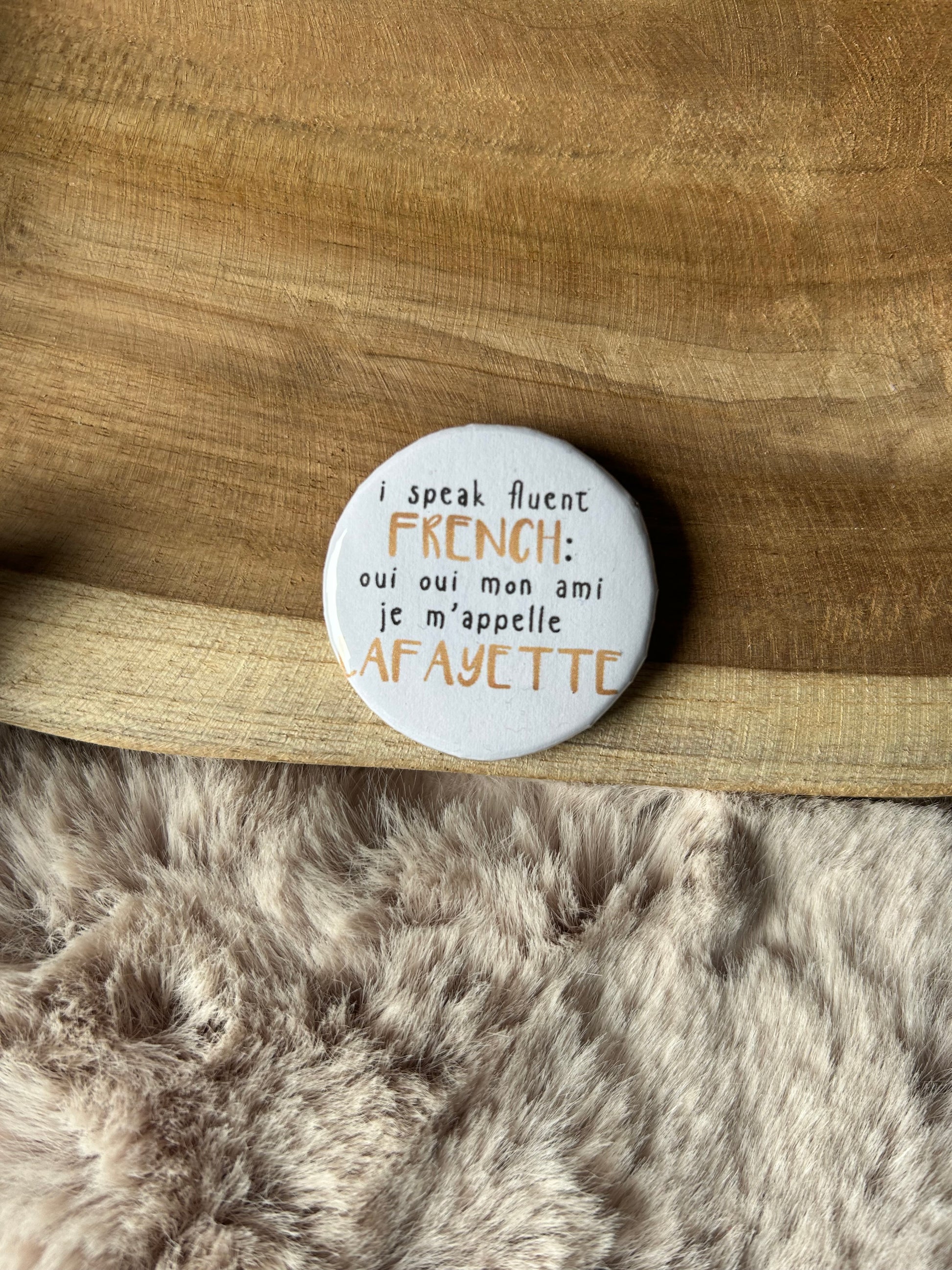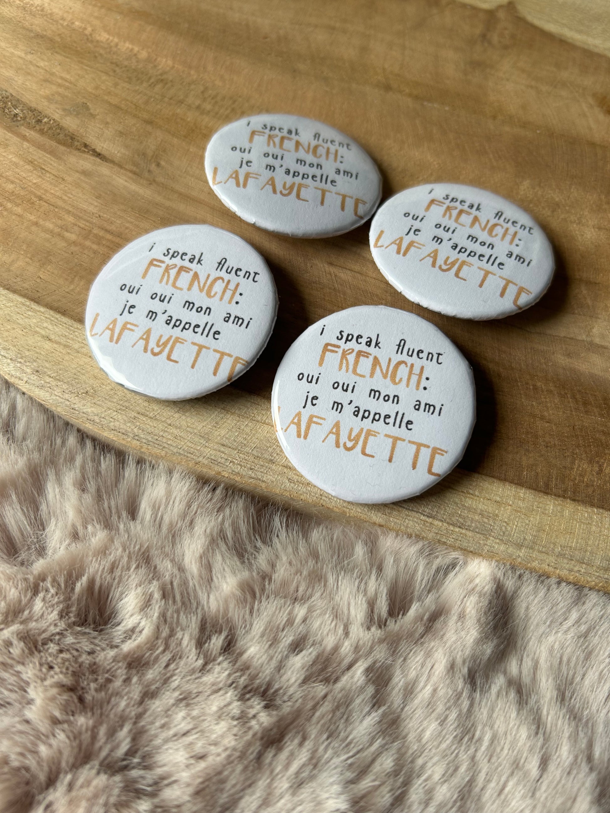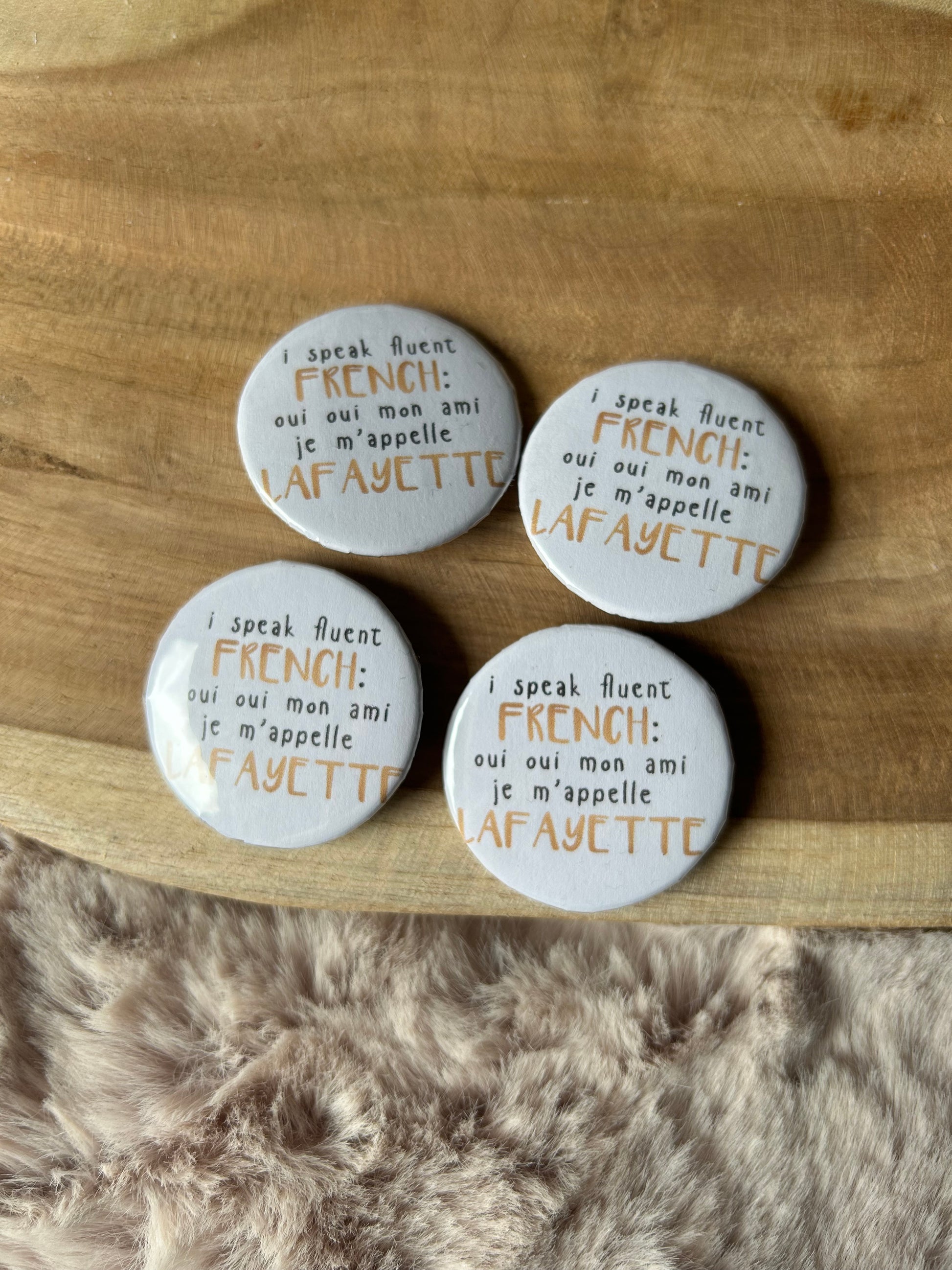 we all know french because of him! these buttons are a fun way of showing that you're the biggest Hamilton, or well, Lafayette fan!