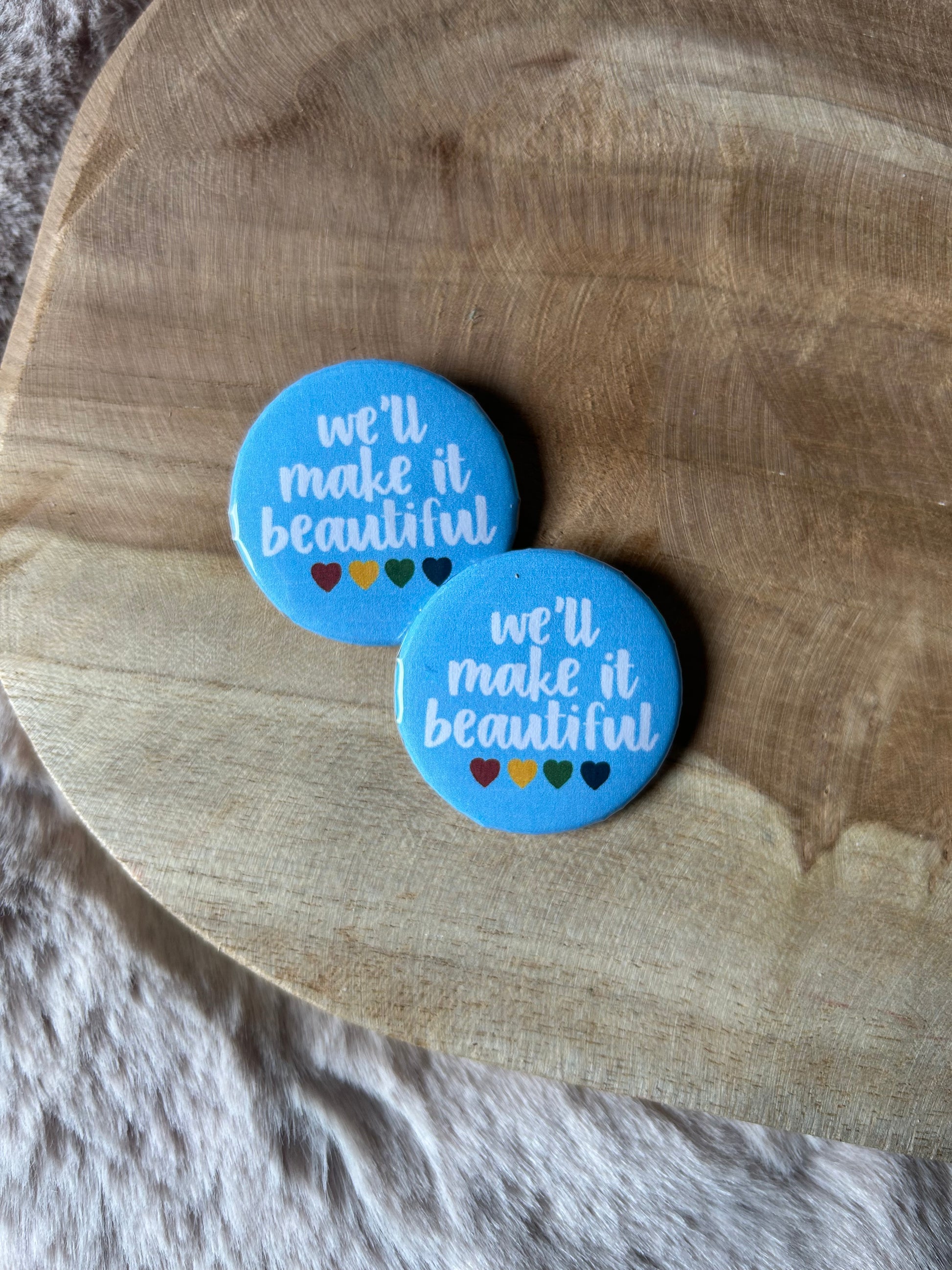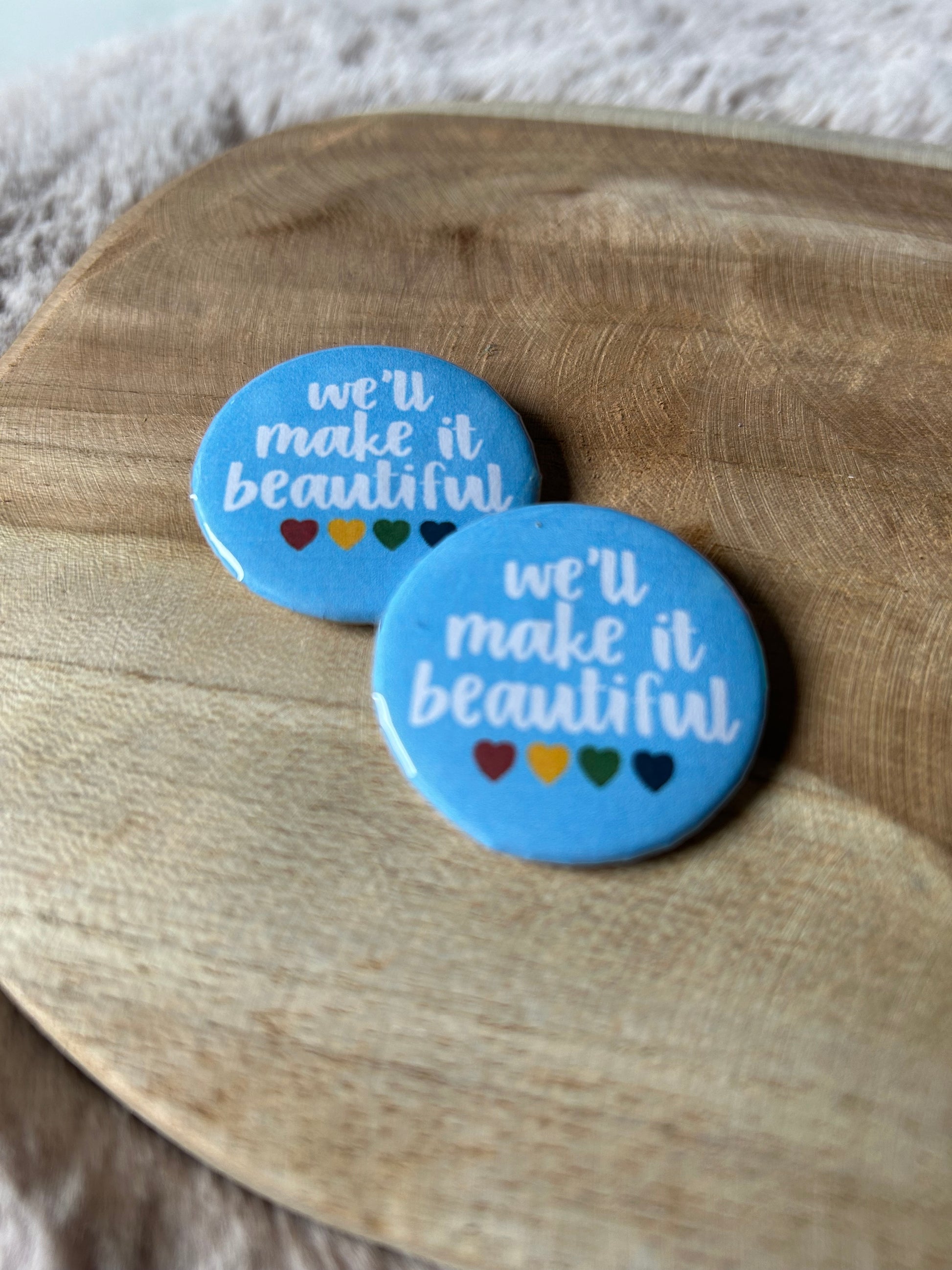Our buttons are completely handmade, we create the print, print it out, cut it out by hand and then press it in the button press! All handmade from the start! These only come in 37 mm for now.