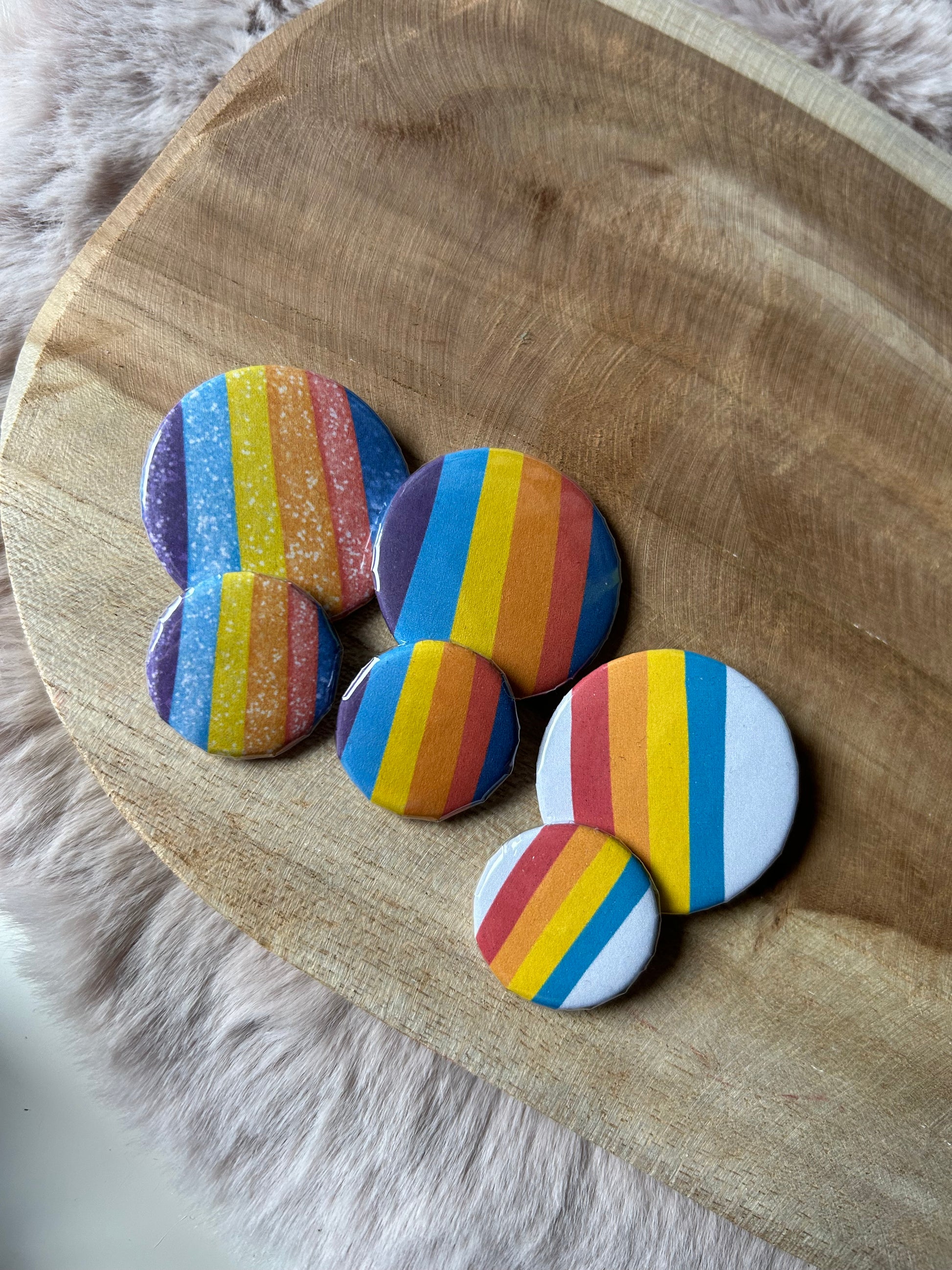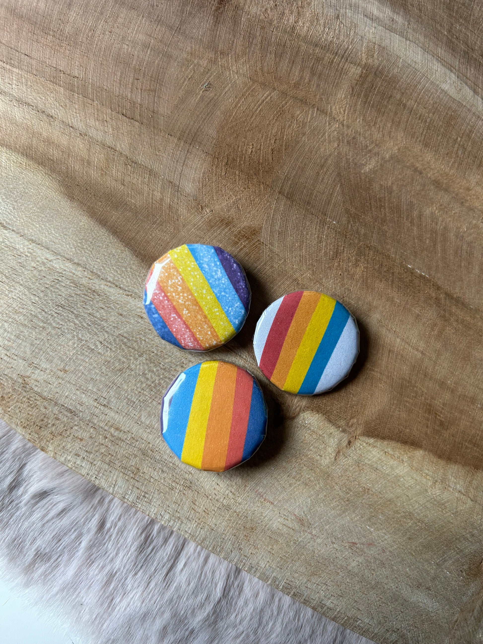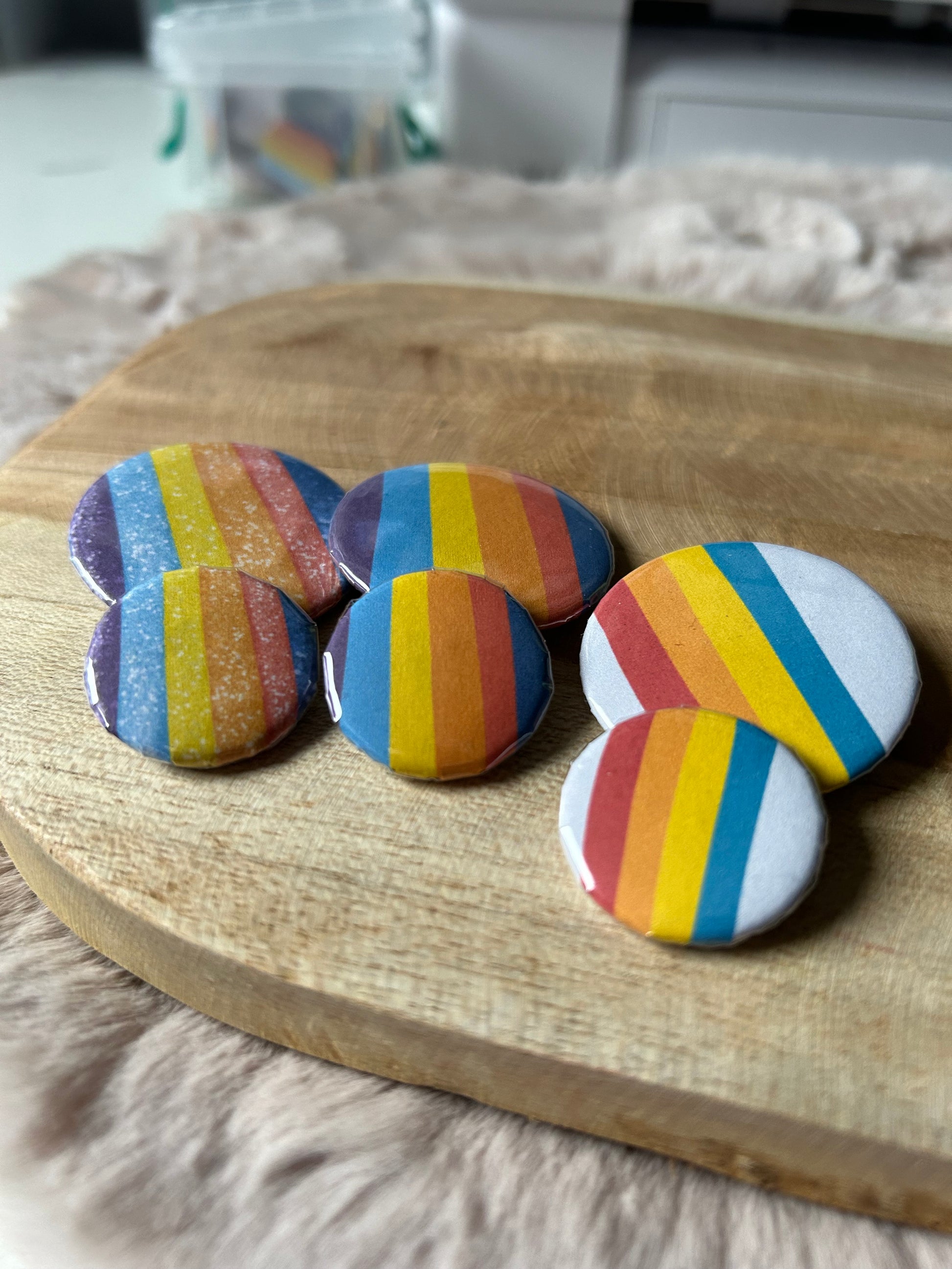 Our buttons are completely handmade, we create the print, print it out, cut it out by hand and then press it in the button press! All handmade from the start!