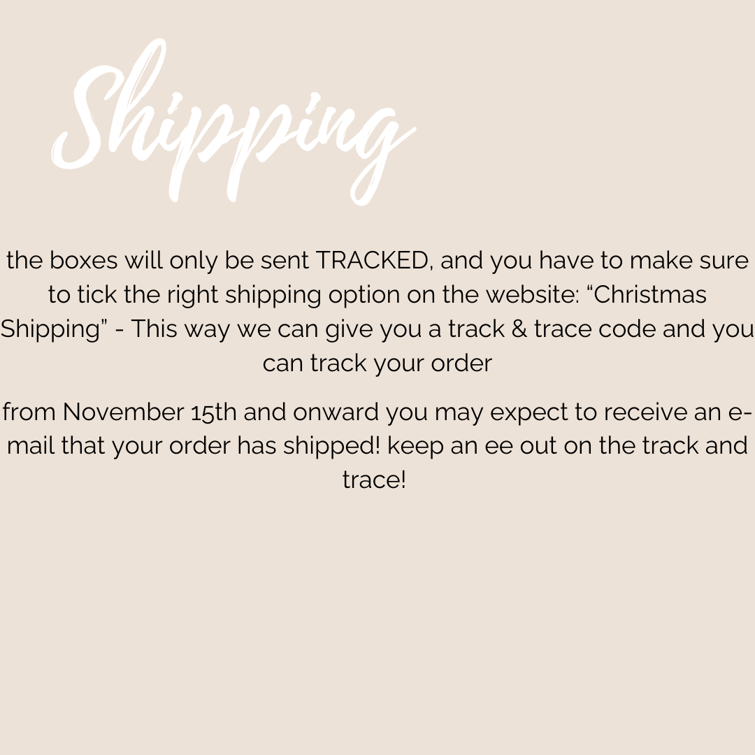 Shipping will happen between November 15 and Decemeber 5th, there will always be a track and trace code sent with the order, so you can track your parcel. Make sure you select the shipping type: "CHRISTMAS SHIPPING".
