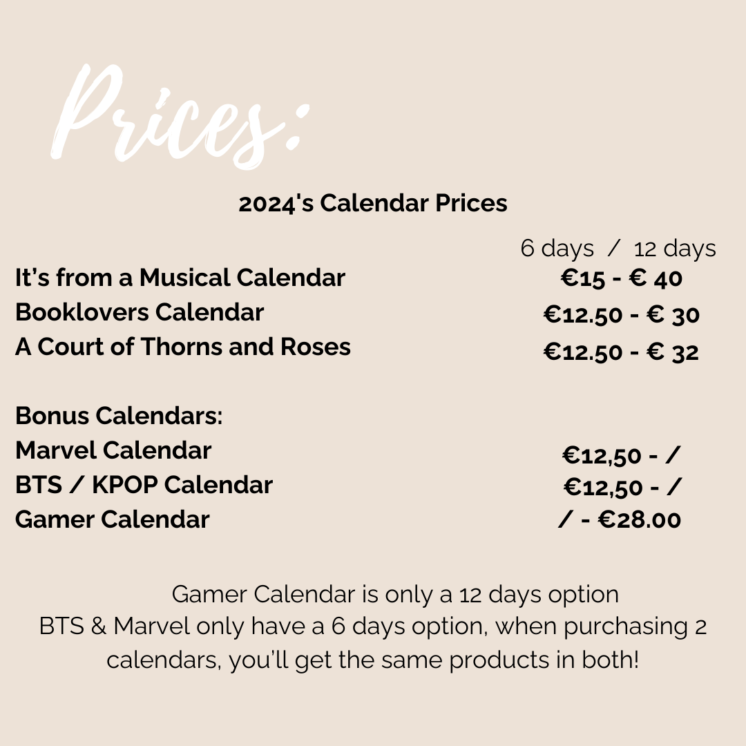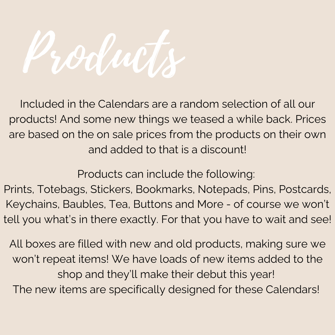 These boxes have been great in the past, so we decided: we'd give them another shot. But as their own theme and more budget friendly! We have a wide range of customers who all like something else and we love that! That's why we want to give back, and give you more Budget Friendly options for different calendars! Here we now have: