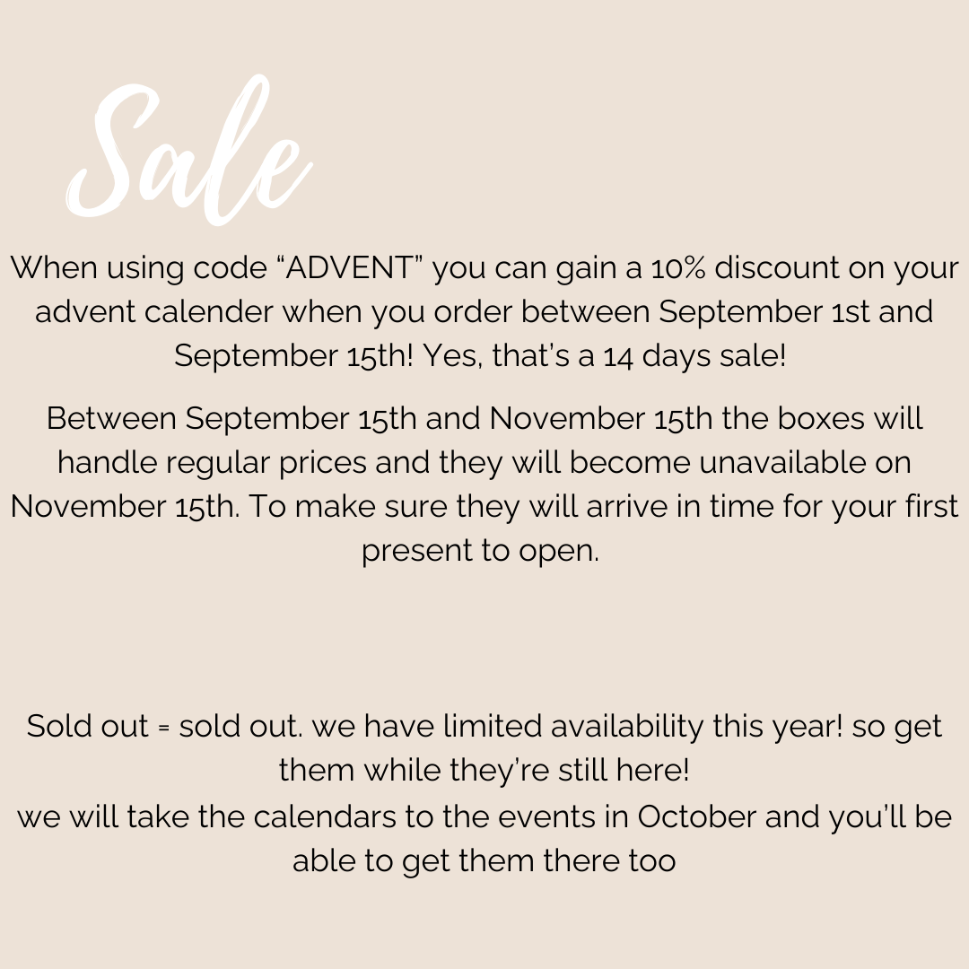 In the period from September 1st, until September 15th there will be 10% all boxes using code “ADVENT”. (prices shown are prices WITHOUT the discount!!)