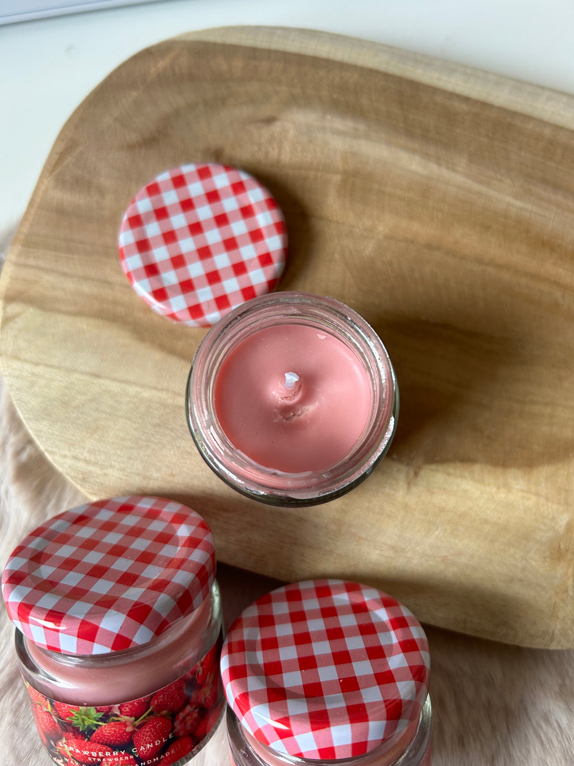 Our Strawberry Jam candles are made from Soy Wax, and have a light Strawberry Smell. With red pigment and natural oils.