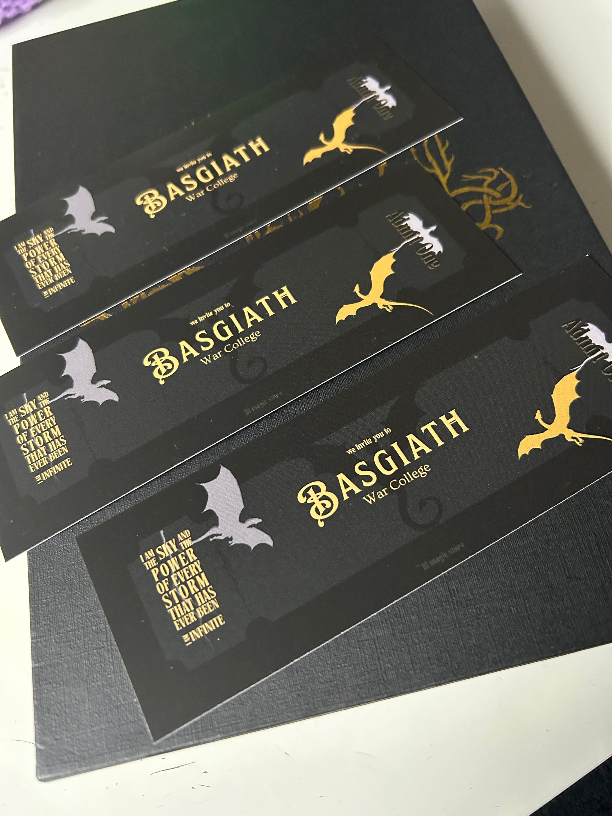 Double-Sided Design: One side features the "Violent Little Thing" motif with dual-colored dragons and striking lightning strikes. The reverse side is styled as a Basgiath War College "Admit One" ticket.